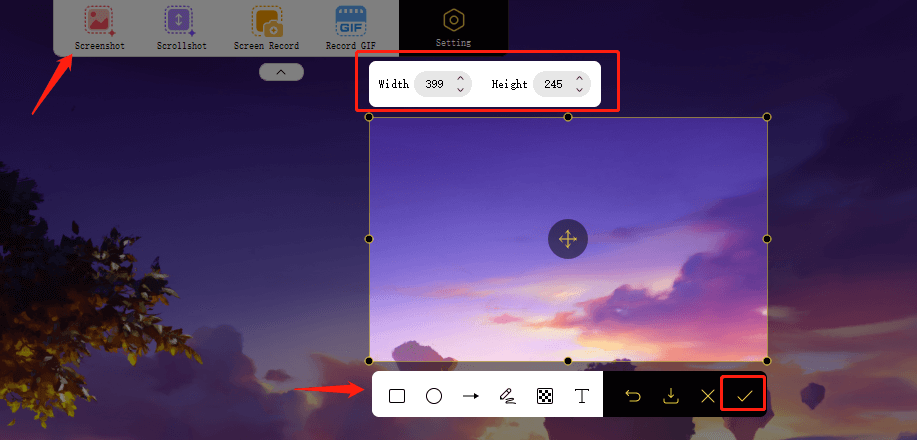 Click on the “Screenshot” button in the toolbar. Then, move your mouse to freely select the area you want to capture. Below the capture area, there is a list of annotation tools you can use to edit the screenshot.